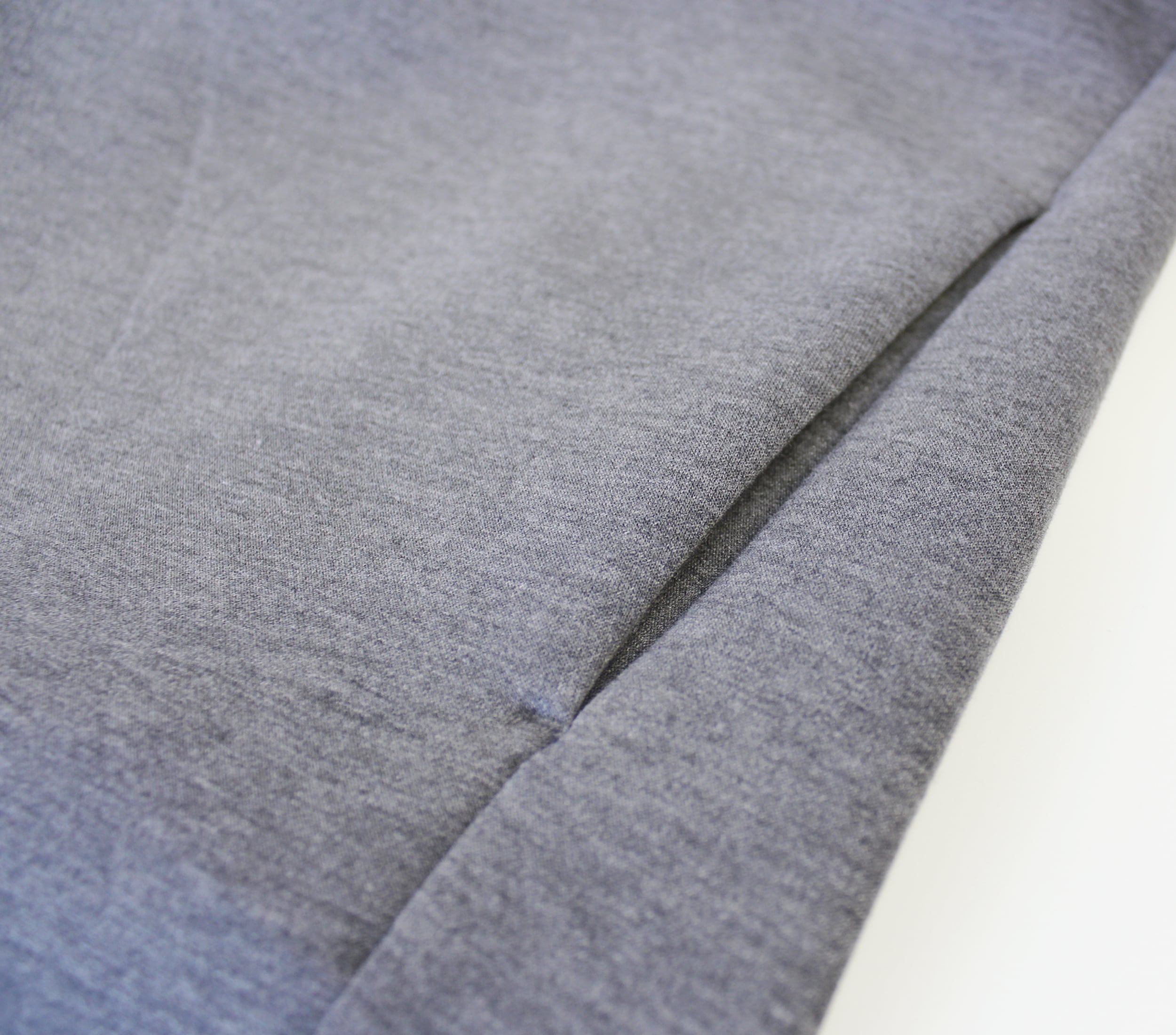 表と裏の二枚の生地を重ねて表面糸と裏面糸を中糸で繋いだ生地で、軽くて保温性が高く、ストレッチの効いたクッション性のある生地です。
