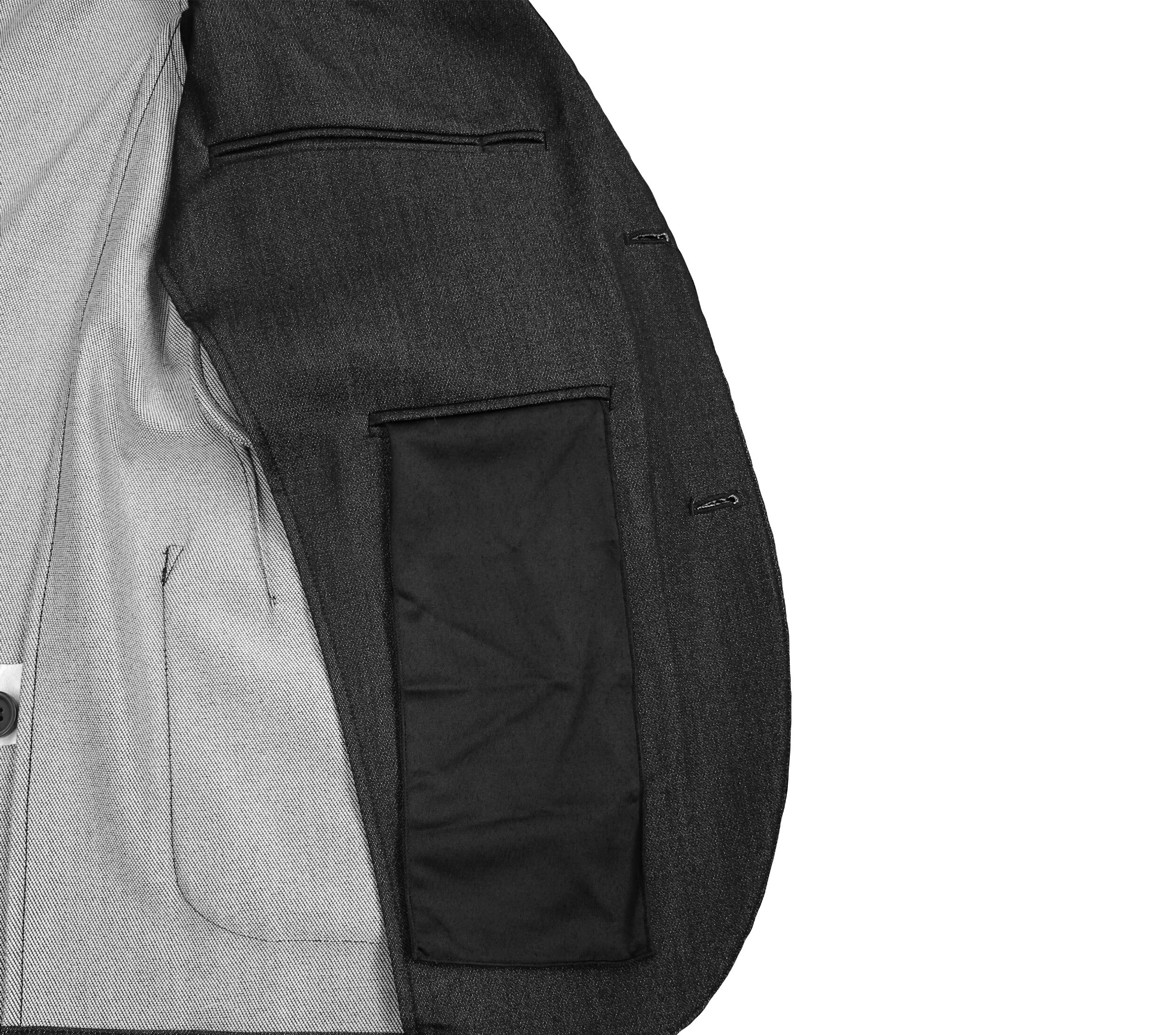 胸ポケットには、眼鏡が転落しないように防止ループが。内ポケットには、眼鏡やスマホの画面を拭けるクロスが付いています。